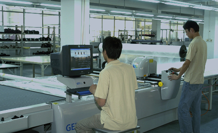 公司采用CAD計算機輔助排料系統(tǒng)進行排料,該系統(tǒng)準(zhǔn)確、高效。鋪料機代替手工鋪料的優(yōu)點使鋪料均勻、整齊、松緊適宜、降低工人勞動強度。