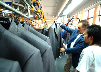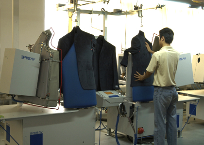 運用高品質(zhì)的德國BRISAY立模整燙機,采用電腦控制蒸汽輸出量、溫度、壓力、定型、抽濕時間,根據(jù)面料的厚薄、質(zhì)地、性能,以38種不同整燙程序調(diào)整以上各個參數(shù),配合服裝的整燙。